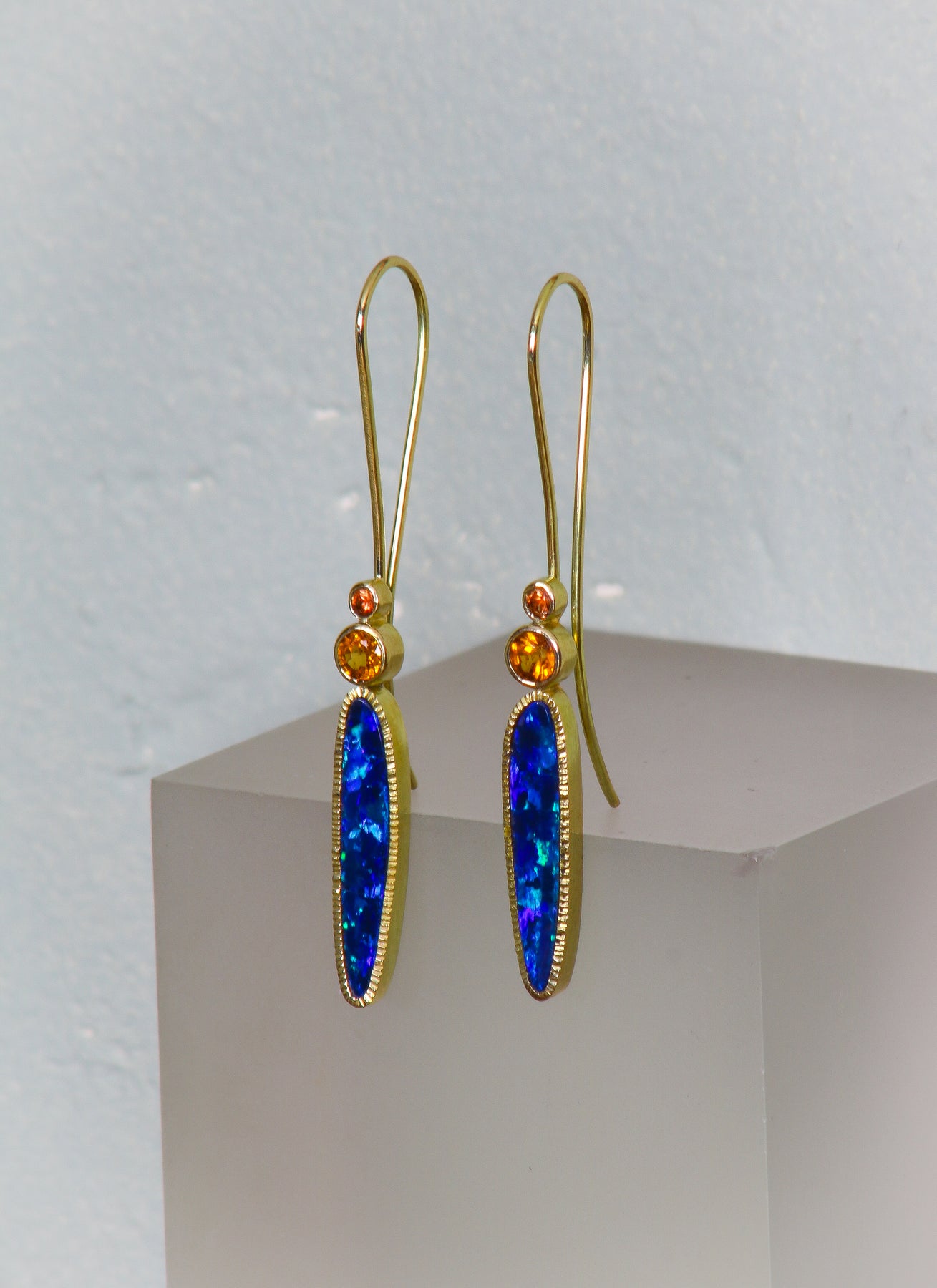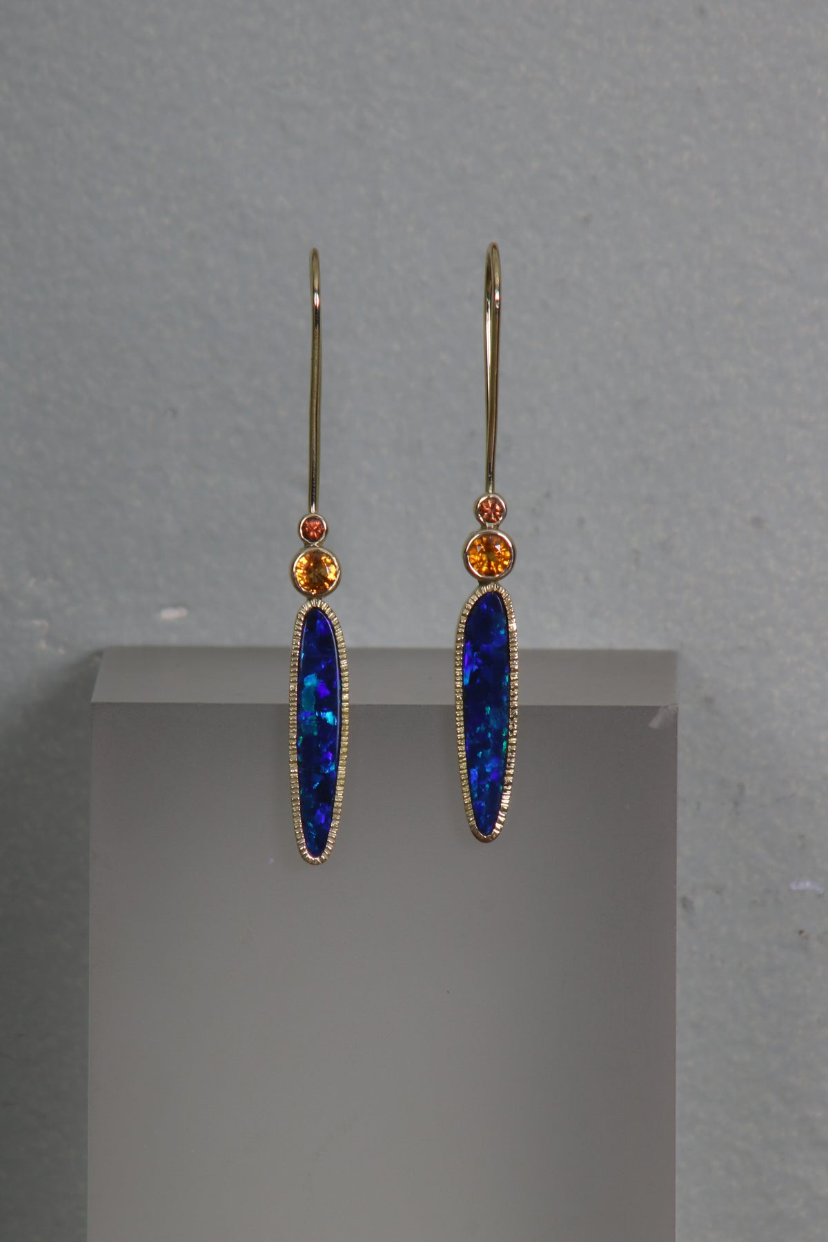 Earrings, Australian Opals, Orange Sapphire (TCW 0.95) 14K Gold.