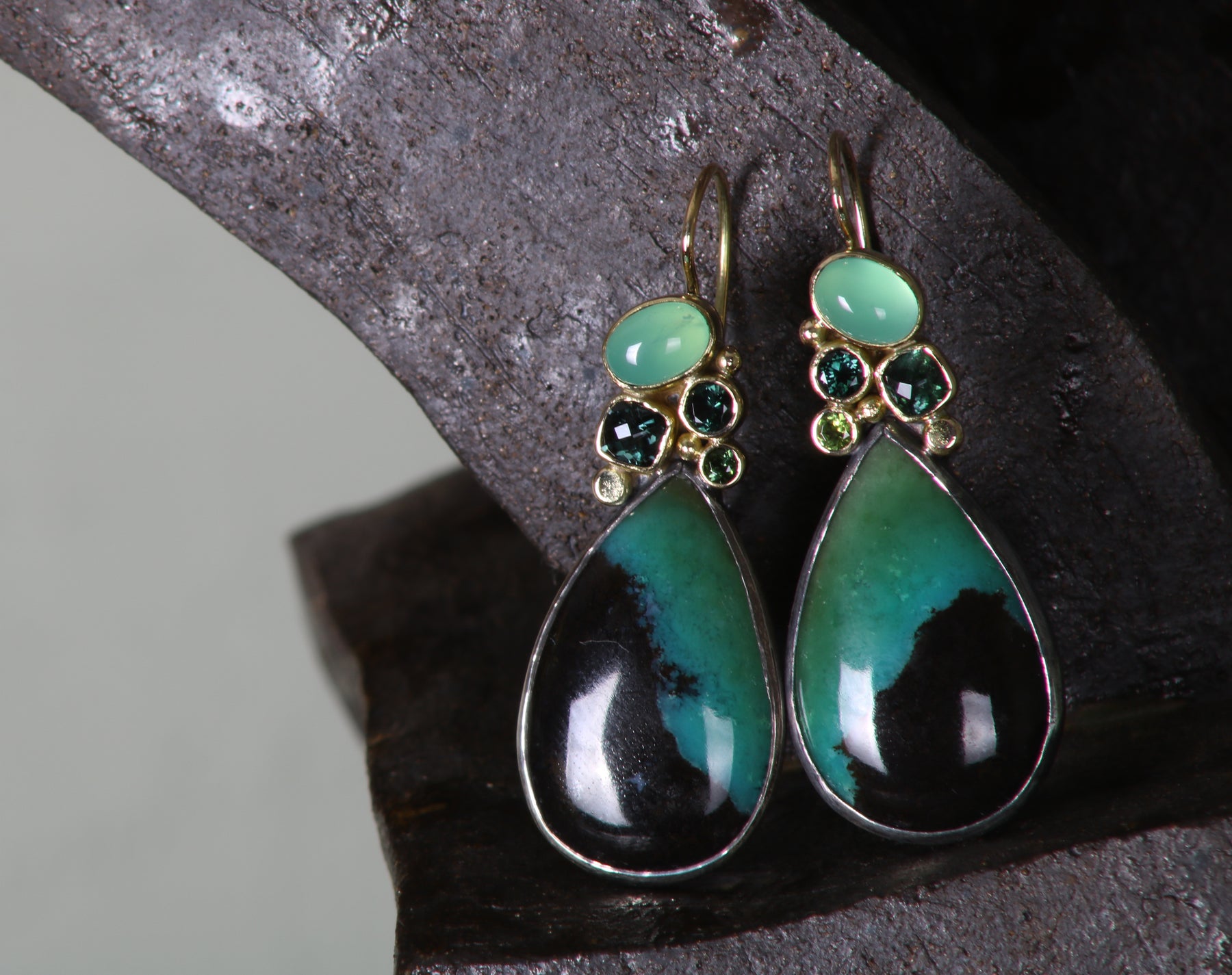 Earrings, Chrysocolla, Chrysoprase, Tourmaline, Green diamond 14K Gold.